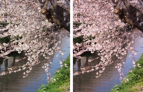 左が元写真、右が桜の花をほんのり赤くの方法で、レタッチしたものです。↓↓↓