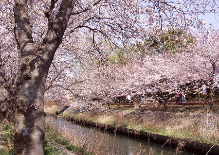 左上、白く見えるのは、川面を埋めた桜の花びらです。
