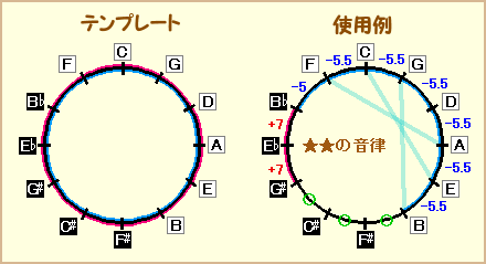 テンプレートを1つ作ってAPD形式で保存しておき、必要に応じて数字を入れたり塗りつぶし&消しゴムで消したりすると、簡単に(音律研究で不可欠の)「五度圏サークル図」というものが描けます。