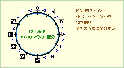 12平均律では、この-24を、12の五度全てに「均等に」-2ずつ分配しています。