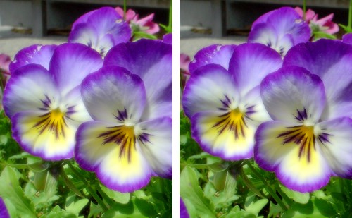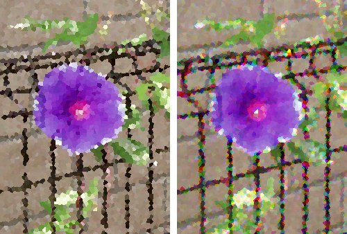 左は元写真にそのまま、右はRGBに分解した3枚のレイヤそれぞれに、「水晶」を初期設定で適用した後、加算合成したものです。 ↓↓↓
