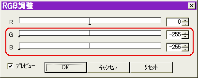 その1番上のレイヤに対し「RGB調整」で、下のようにR以外を-255にしてOKします。