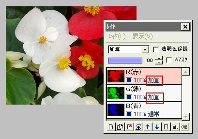 光の三原色は加算混合なので、上2枚のレイヤ合成モードを「加算」にします。