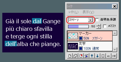最初は、文字画像とは別レイヤにマーカー風の太い線を描いて、レイヤの不透明度を下げればそれでいいかな?と思ってたのですが・・・